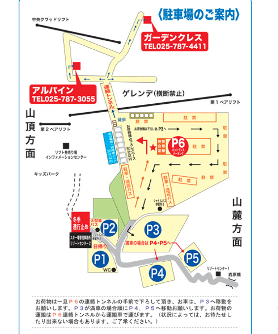 尚、P6から宿までゲレンデ内を350m 5,6分歩きます。(雪道になりますので履物を考慮してください。)